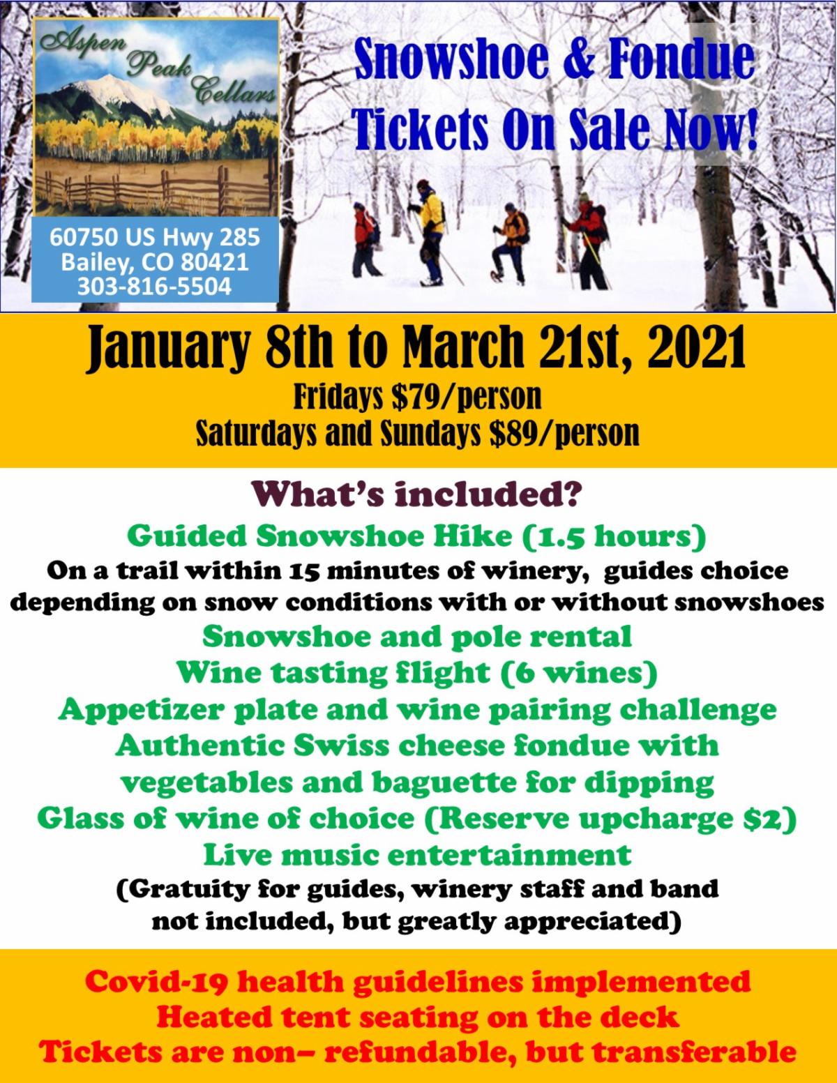 Join us for Aspen Peak Cellars original Snowshoe & Fondue event, a classic Colorado day of fun (10:30AM -3:30PM) including, guided snowshoeing, appetizers, wine tasting, authentic Swiss cheese fondue, glass of wine, live music, social distancing and health guidelines in place due to Covid-19.