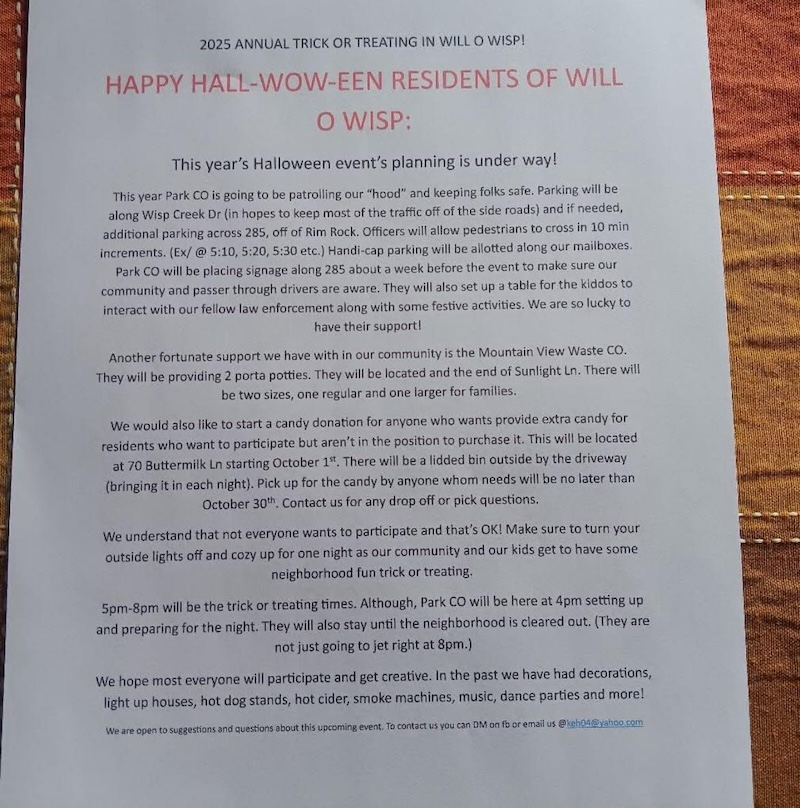 If you would like to donate candy to the neighborhood, you can drop bags off in the tote at the Park County Sheriff's substation in Bailey.