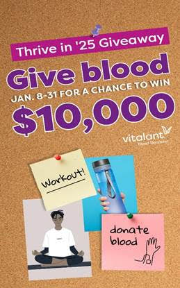 Resolve to share your good health with others in 2025 by giving blood, platelets or plasma. Donate Jan. 8-31 and you’ll be entered for a chance to win a $10,000 gift card! Make this healing resolution a life-changing one – for you and the patient on the receiving end of your generous gift! Schedule today.