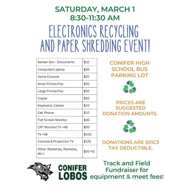 Electronics recycling and paper shredding event at Conifer High School on March 1st from 8:30 to 11:30 am to support Track and Field. Bring your old electronics and papers for disposal to help support our track and field program!