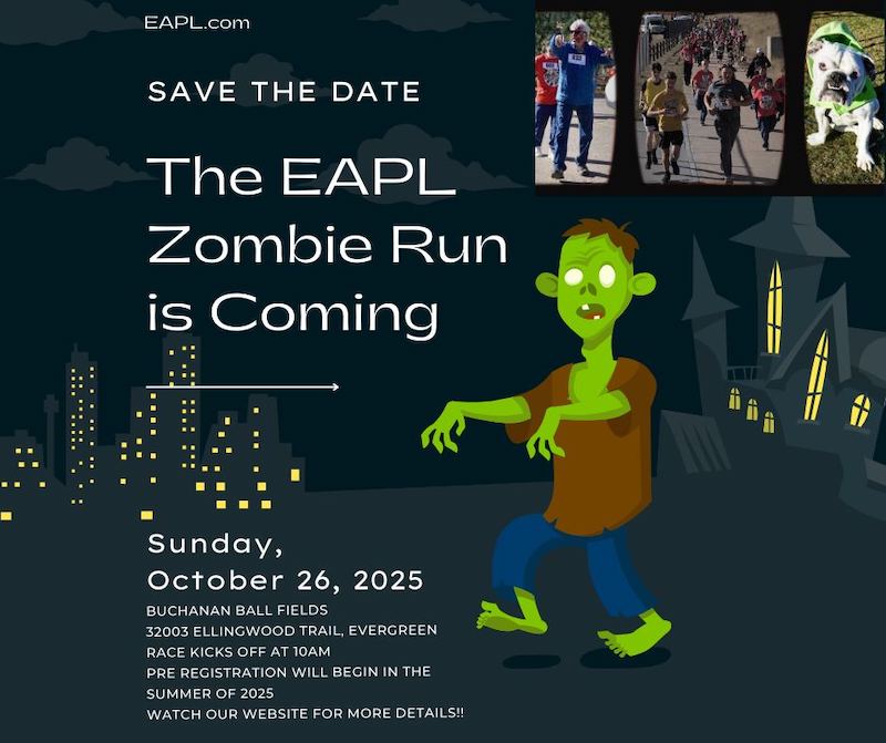 Join us for a zombify-ing time at our annual Zombie Fun Run!! Food, goodies, vendors, costume contest and more! https://eapl.com/event/2025-zombie-fun-run-walk-or-crawl-5k/
