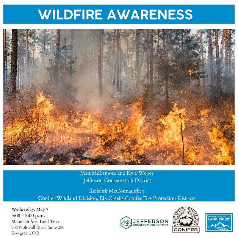 With the ‘traditional’ fire season upon us, now is the time to educate yourself on wildfire awareness from the experts. Next month, we will host Jefferson Conservation District and Conifer Wildland Division, Elk Creek/ Conifer Fire Protection Districts experts who will discuss the history and ecology of Colorado’s Front Range forests, the wildfire challenges we face, and what can be done—presented from both public and private land perspectives.