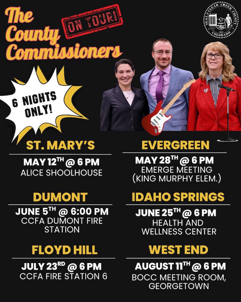 With six planned meetings (and possibly more to come) strategically located throughout unincorporated Clear Creek County and its towns, this tour aims to maximize accessibility and engagement. The Commissioners are eager to connect with residents in their own neighborhoods and discuss a wide range of pertinent topics, including the county budget, ongoing and upcoming road projects, and more. This is your opportunity to voice your concerns, ask questions, and directly influence the decisions that impact your community. Mark your calendars—the Commissioners are genuinely looking forward to hearing from you and fostering a stronger, more informed Clear Creek County.