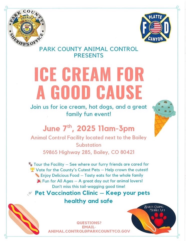 Join Park County Animal Control for our first-ever Ice Cream Social Fundraiser! Come tour the facility, enjoy free ice cream and hot dogs, win amazing raffle prizes, and connect with the community — fun for the whole family! Plus, low-cost pet vaccines from Bailey Caring Hands Mobile Vet!