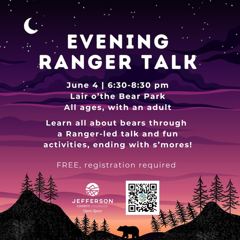 Join a Jeffco Ranger at Lair o' the Bear Park for a fun evening all about bears. Learn about our "Furry Nope" friends and enjoy activities. Afterwards, warm up over a propane fire pit as you make s'mores and chat with a ranger!