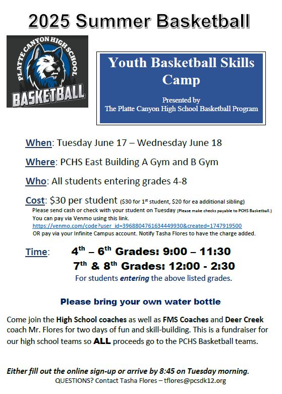 Youth Basketball Skills Camp presented by Platte Canyon High School Basketball Program. Come join the high school coaches as well as FMS coaches and Deer Creek coach Mr. Flores for two days of fun and skill-building. This is a fundraiser for our high school teams so ALL proceeds go to the PCHS basketball teams.