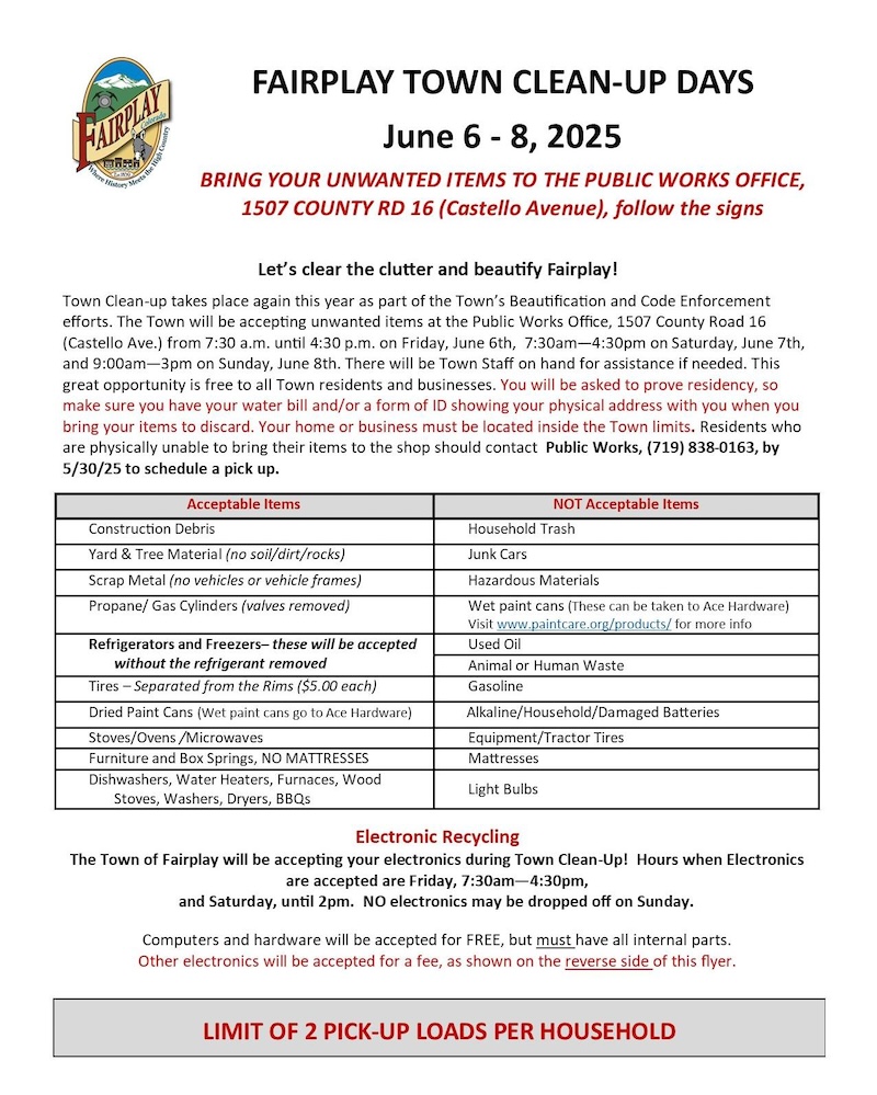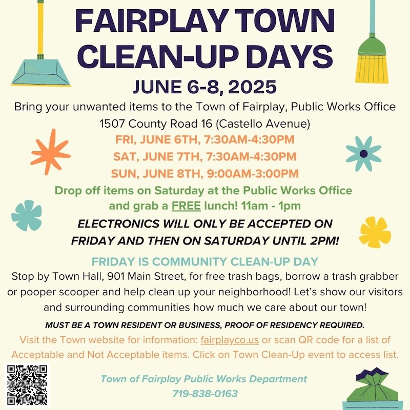 Time for spring cleaning! Mark your calendars for Fairplay Town Clean-Up Days, June 6th-8th! While you gather unwanted items around home, think about grabbing a piece of trash on a walk, help a neighbor in need, spend 15 minutes cleaning up at the Beach, Cohen Park or Town streets. Let's work together to make our town shine!
