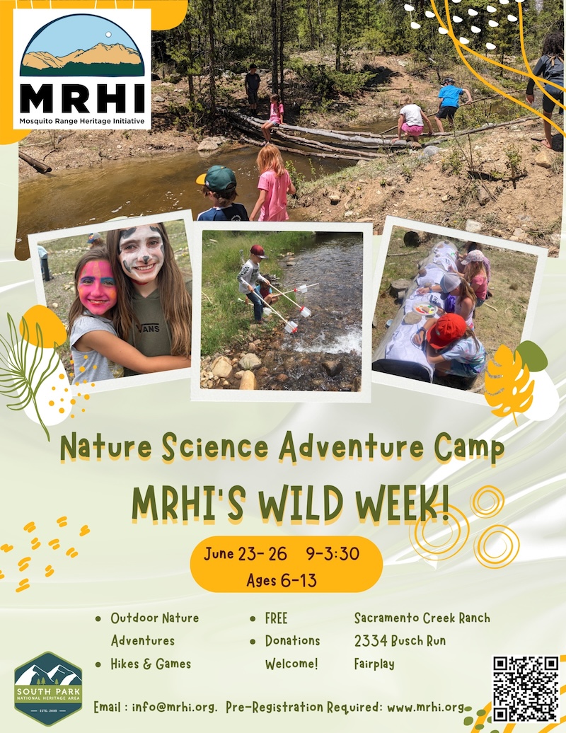 Mosquito Range Heritage Area's Nature Science Adventure Camp is back! June 23-26 from 9am-3:30pm daily for ages 6-13. Register using the QR code in the flyer below.