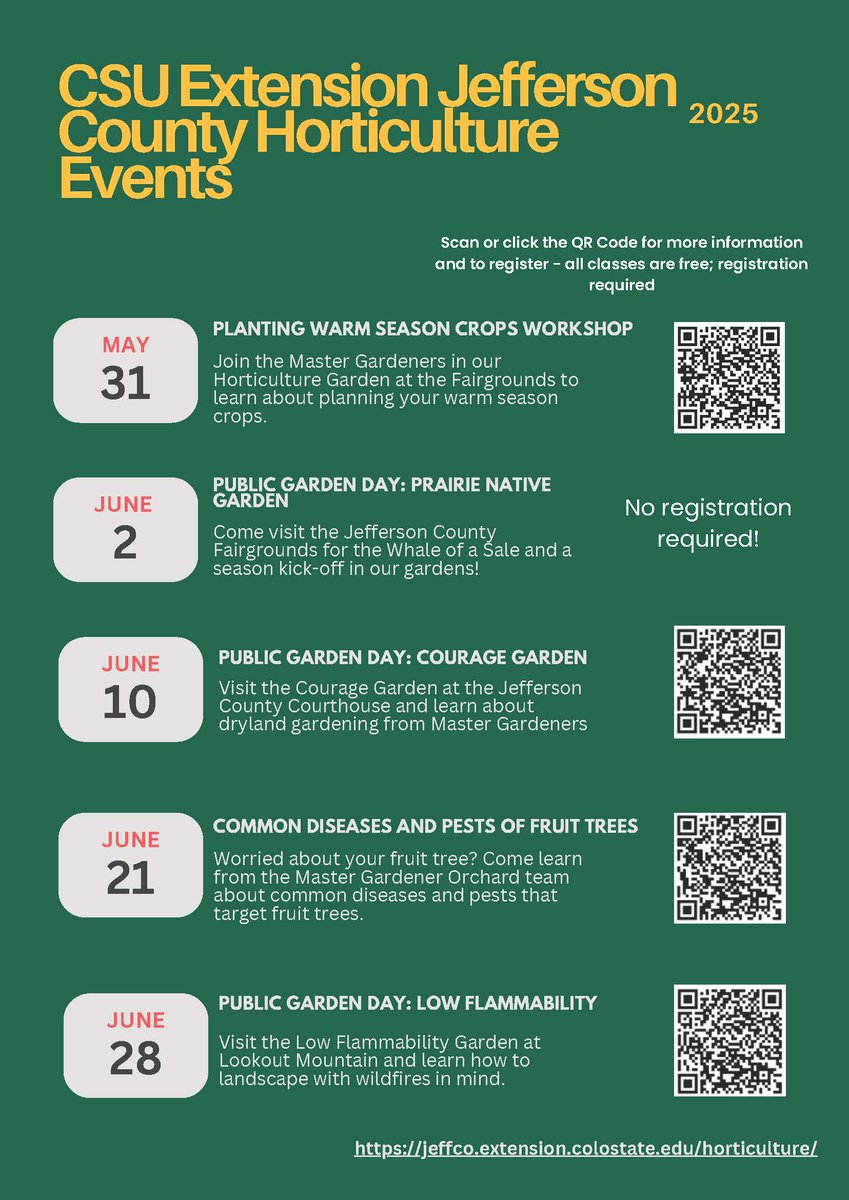 CSU Extension - Jefferson County: Join the Master Gardeners at the Horticulture Garden at the Fairgrounds to learn more about planning your warm season crops. Click the https://jeffco.extension.colostate.edu/horticulture to sign up, or scan the QR code below next to each class description.