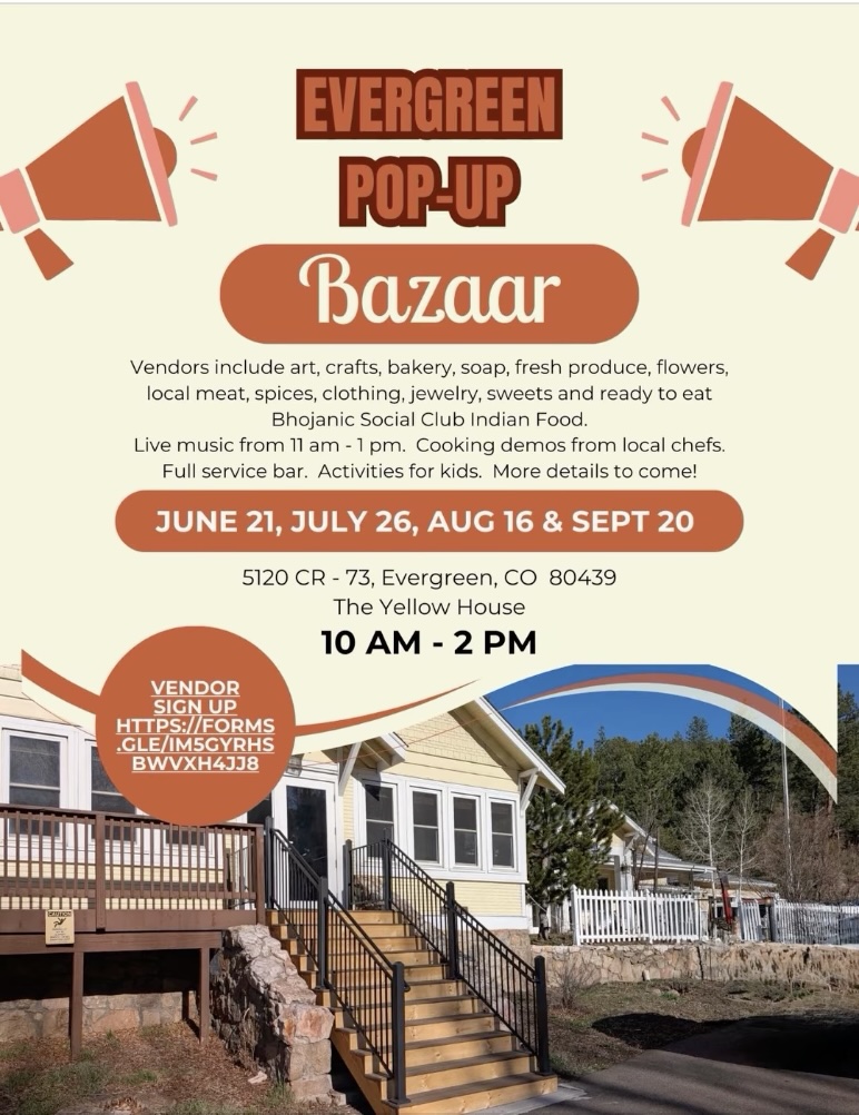 Evergreen Pop-Up Bazaar SUMMER 2025 / 10 am - 2 pm on June 21, July 26, August 16 and September 20.  NEW LOCATION Bhojanic Social Club, 5120 Co Rd 73, Evergreen, CO 80439. (The Old Yellow Seniors House).