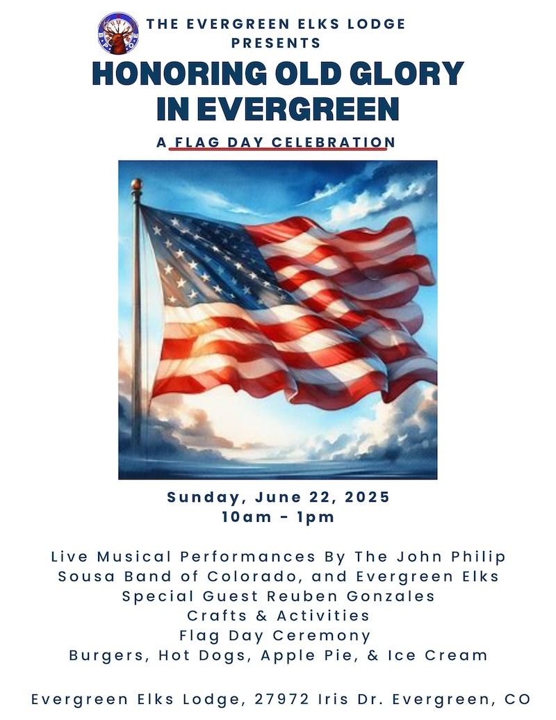 Raise the flag and your spirits! Join us for a free, family-friendly Flag Day celebration in the heart of Evergreen. We’re honoring Old Glory with music, community, and patriotic pride beneath the mountain skies! Live music by The John Philip Sousa Band of Colorado and Evergreen Elks Special Guest Reuben Gonzales.