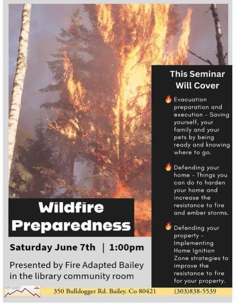 Fire Adapted Bailey is the local Firewise/Ambassador/Wildfire Education group in Bailey that works closely with Rotary Wildfire Ready and Platte Canyon Fire Department. They will be hosting an event this weekend using RWR educational materials (dioramas, brochures, go bag, what-to-wear banner, graphics etc). Stop by ad see them and become more Wildfire Ready!
