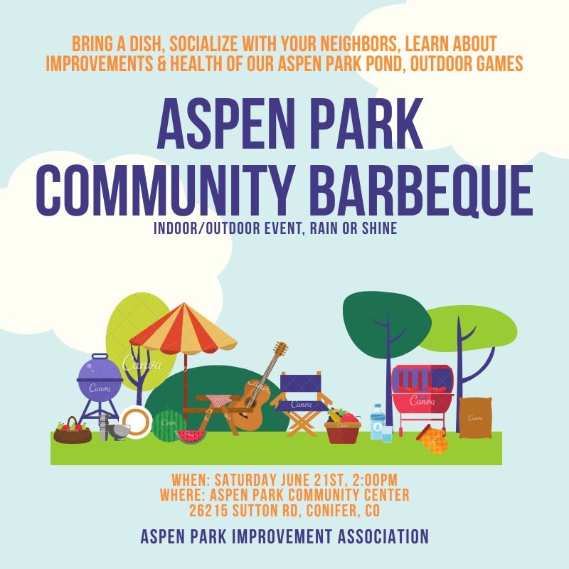 Join us for this annual event at the Aspen Park Community Center, a fun get together with your friends and neighbors. This is an indoor/ outdoor event, rain or shine. Good food and outdoor games. We will have a brief APIA Annual Meeting & Elections. We’re excited to feature guest speaker Phil Hirshman of Colorado Pond and Lake. Learn about the health and latest improvement to our Aspen Park Pond, owned by the Aspen Park Improvement Assoc. We will provide the main dish and potato salad. If your last name begins with A-N bring a side dish, O-Z bring a dessert. This event is open to the public, and we’re always welcoming new members, volunteers, and neighbors to be part of the Aspen Park Improvement Association. See you there!