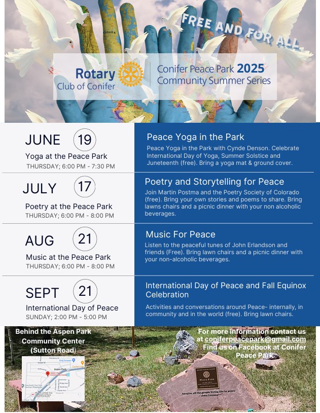 Location Conifer Peace Park behind the Aspen Park Community Center, 26215 Sutton Rd, Conifer, CO 80433