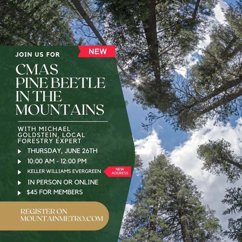 NEW CMAS CLASS! Join us on Thursday for our newest CMAS class about how pine beetle impacts our ecology and wildfire risk. "Bugs, Bark & Buyers: Understanding Mountain Pine Beetle and Forest Health for Foothills Realtors" A Practical Guide to Tree Types, Pests, and Their Real Estate Impacts. Register on mountainmetro.com