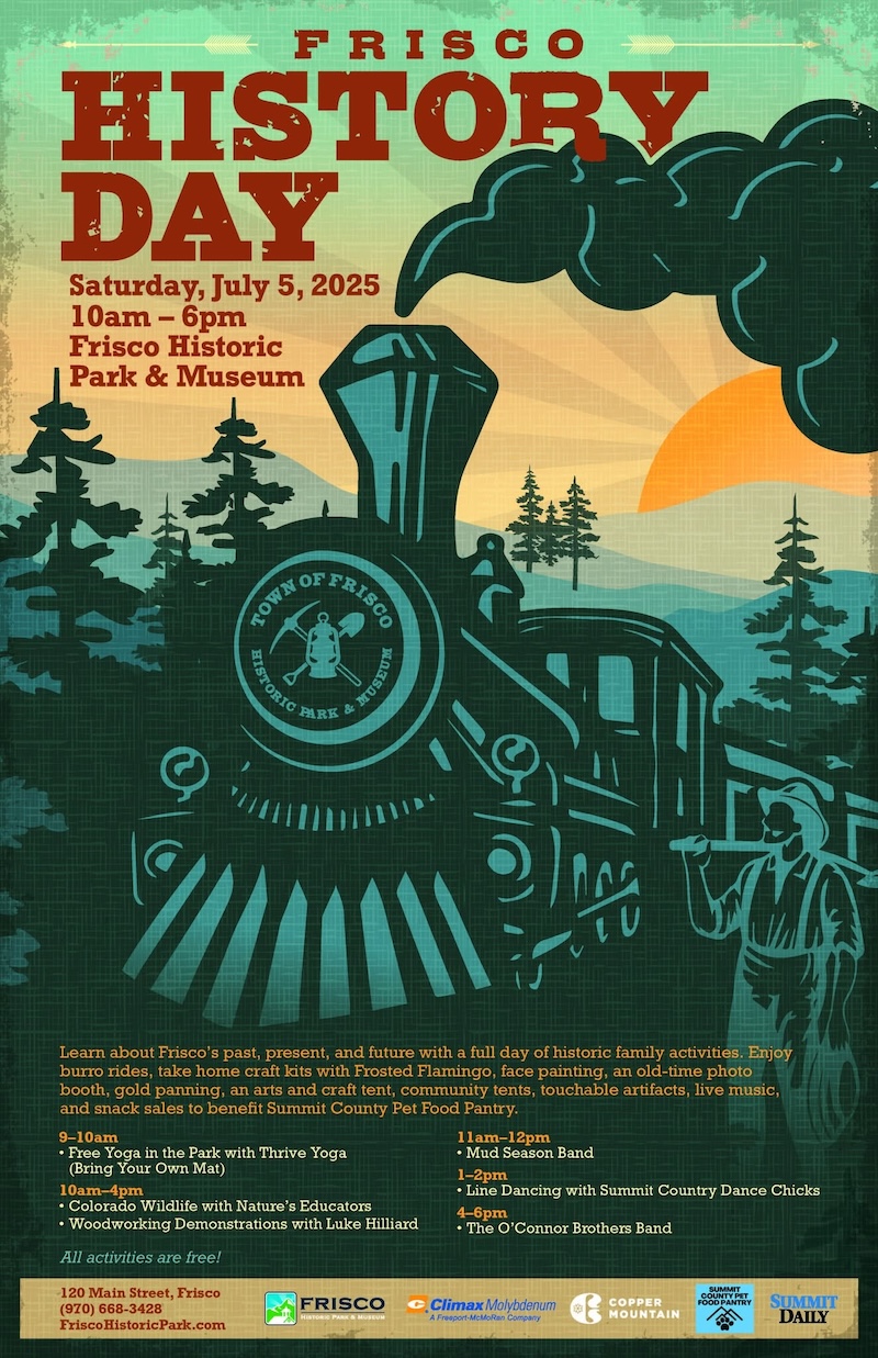 Frisco History Day sponsored by Climax Molybdenum and Copper Mountain, returns to the Frisco Historic Park and Museum with a full-day of family-friendly activities and more. On Saturday, July 5, 2025, from 10:00 am – 6:00 pm, attendees are invited to travel back in time to experience Frisco’s past with a full day of free activities at the Frisco Historic Park and Museum. The event will feature education pop-ups, burro rides, face painting, take-home crafts from Frosted Flamingo, touchable artifacts, live music, and more.