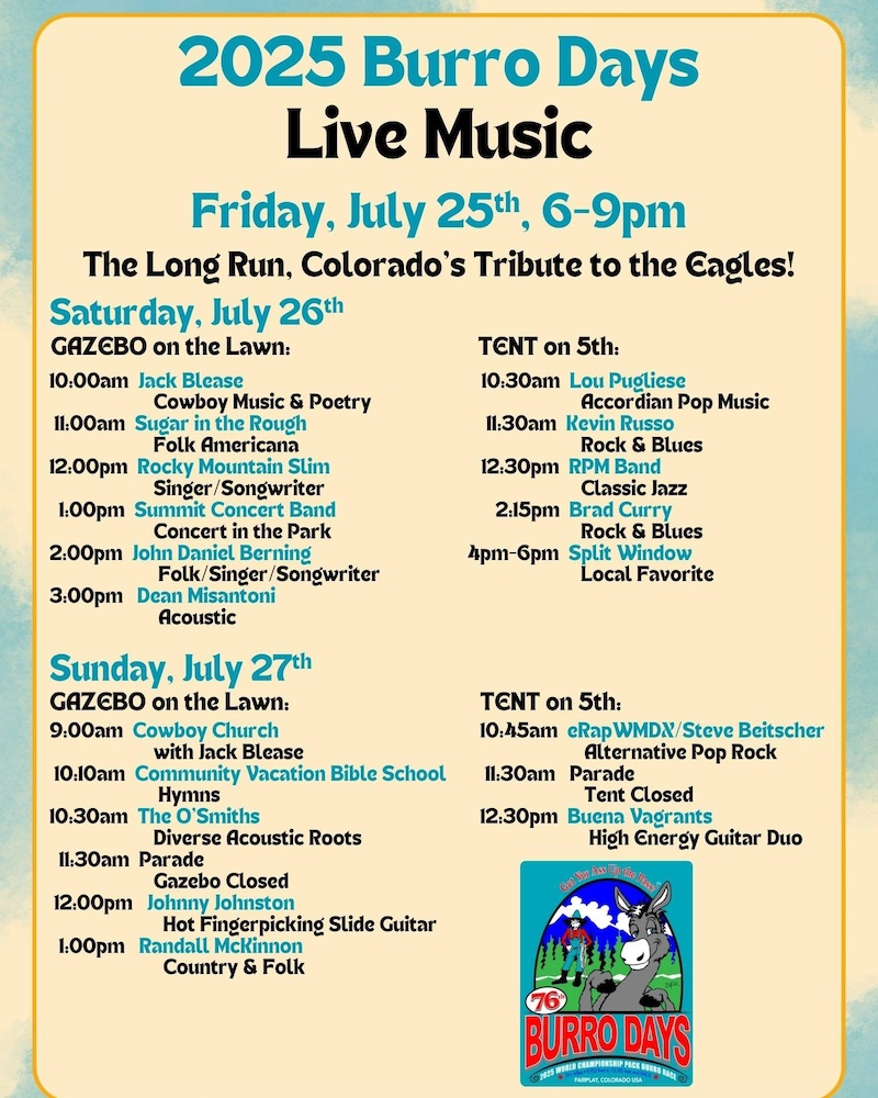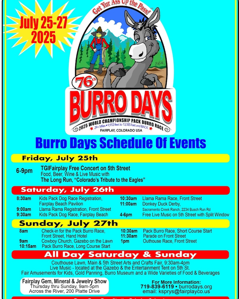 Join us for the 76th Burro Days, July 25-27, in Fairplay, CO! Kick things off with The Long Run, Eagle's Tribute Band, from 6-9pm on Friday, July 25th. Arts & Crafts booths will be on on Saturday and Sunday 9:30am-4pm and you can enjoy live music at the Gazebo and 5th Street stage throughout the weekend. Hungry? Food trucks will be open too! Before watching the llamas run, sign up your kiddo and pup for the Kid's Pack Dog Race at the Fairplay Beach. Don't forget what it's all about, the World Championship Pack Burro Race on Sunday, July 27th! The Long Course starts at 10:15am and the Short Course at 10:30am. See you there! https://burrodays.org/