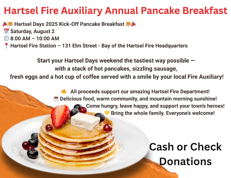 The Hartsel Fire Auxiliary warmly invites you to our Kick-Off Pancake Breakfast on Saturday, August 2nd from 8–10 AM at the Hartsel Fire Station! Come hungry and start your weekend with fluffy pancakes, sizzling sausage, and hot coffee — all served up by your friendly local volunteers. This donation-based breakfast is a great way to support the Hartsel Fire Department while connecting with neighbors, friends, and visitors. Let’s celebrate community, good food, and small-town spirit — we can’t wait to see you there!