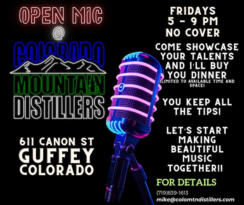 Hey musicians, poets, comedians, and performers of all kinds—Colorado Mountain Distillers in Guffey, Colorado, is hosting an Open Mic Night! Bring your talent, introduce yourself, play a set or two, and keep all of your tips. As a thank-you, dinner is on me. If you’re interested in performing or want to schedule a featured set after we meet, get on up here—let’s make it happen!