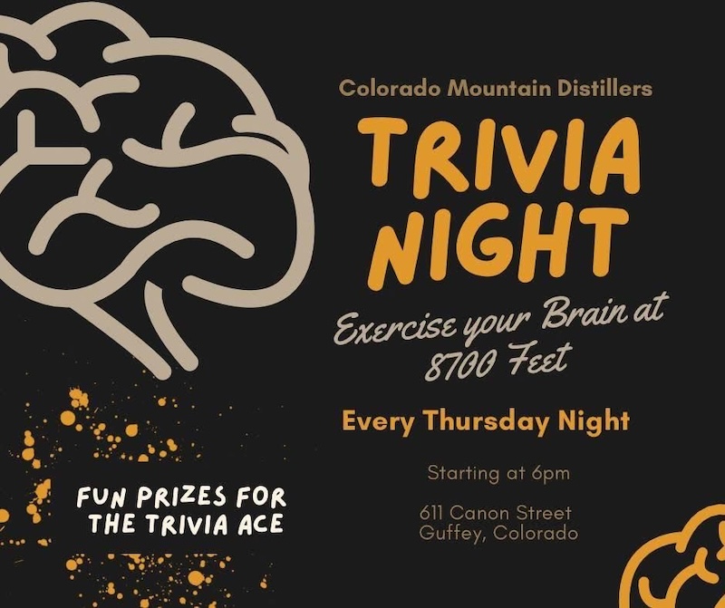 Every Thursday night at Colorado Mountain Distillers, join us for an evening of flavor and fun with Trivia & Taco Thursday! Starting at 6pm, we’re serving up street taco specials—choose from mouthwatering shrimp, pork belly, or carnitas—perfectly paired with handcrafted spirits. While you enjoy your tacos, get ready to test your wits with three exciting rounds of trivia, featuring fun prizes for the top team. It’s a great way to unwind, laugh with friends, and keep your brain sharp—all at 8700 feet in the heart of Guffey. Come hungry, come smart, and come ready for a great time!