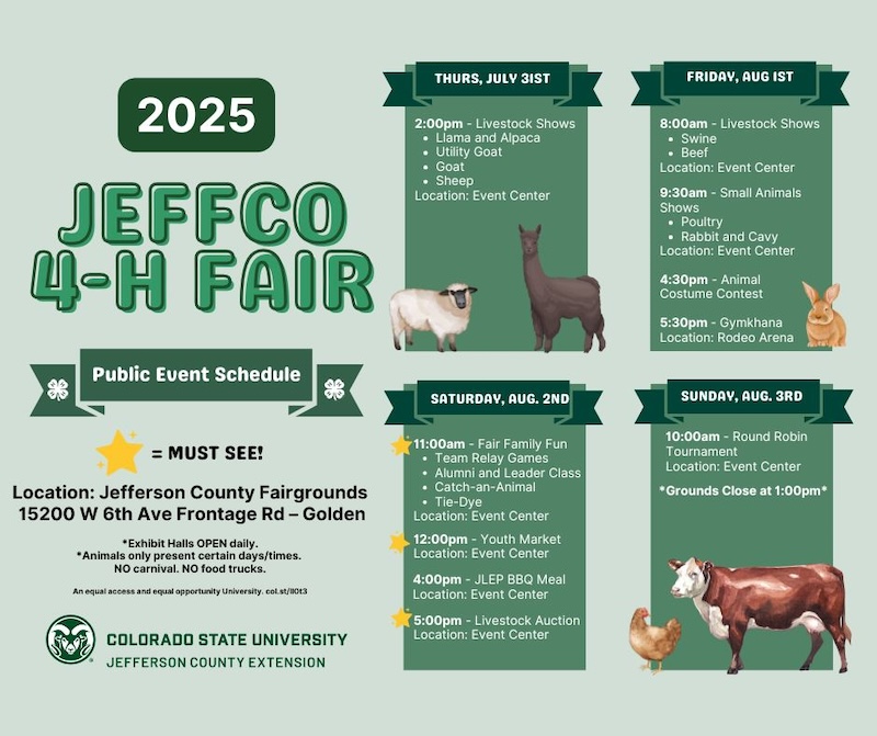 Check out our upcoming events happening this week as part of the Jeffco 4-H Fair, including livestock shows, gymkhana events, youth market, BBQ fundraiser, and livestock auction!