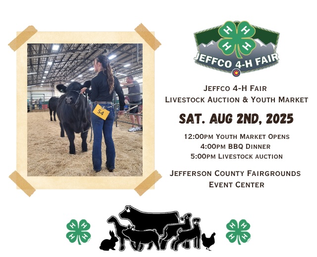 Join Jeffco 4-H for our annual Youth Market, BBQ Dinner Fundraiser, and Livestock Auction. This is a fantastic opportunity for community members to come out and support the hard work our youth have dedicated all year.
