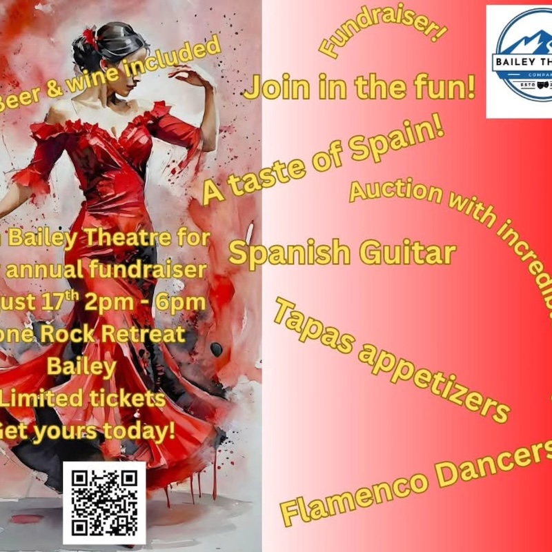 Come and getaway to Spain! Our themed fundraiser this year will be filled with Tapas appetizers, Spanish guitar music from Gio Barabadze and then a performance of Flamenco dancing by Colorado Institute of Flamenco. Join us for a fun filled afternoon at Lone Rock Retreat and savor the classic tastes of Spain. Beer and Wine are complimentary. We will have an auction on-line that will be available around August 8th, and you can continue to bid while you're at the event. The auction is filled with many amazing items. Come celebrate the sixth season of Bailey Theatre and learn about professional theatre in Bailey.