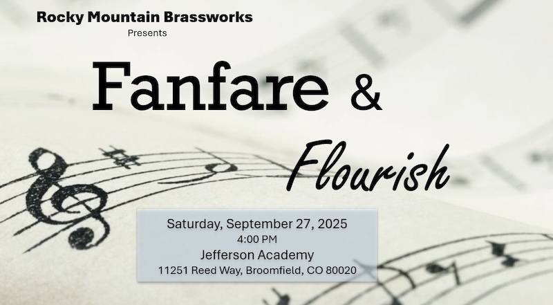Rocky Mountain Brassworks proudly presents Fanfare & Flourish, a concert filled with dazzling energy, heartfelt lyricism, and toe-tapping rhythms. The evening opens with James Curnow’s brilliant Fanfare and Flourishes and journeys through the fiery march The Cossack, the baroque brilliance of Frescobaldi’s Toccata, and Mary Mixter’s elegant Theme and Variations. From classical masterworks to jazz favorites, this concert promises something for every listener to enjoy.