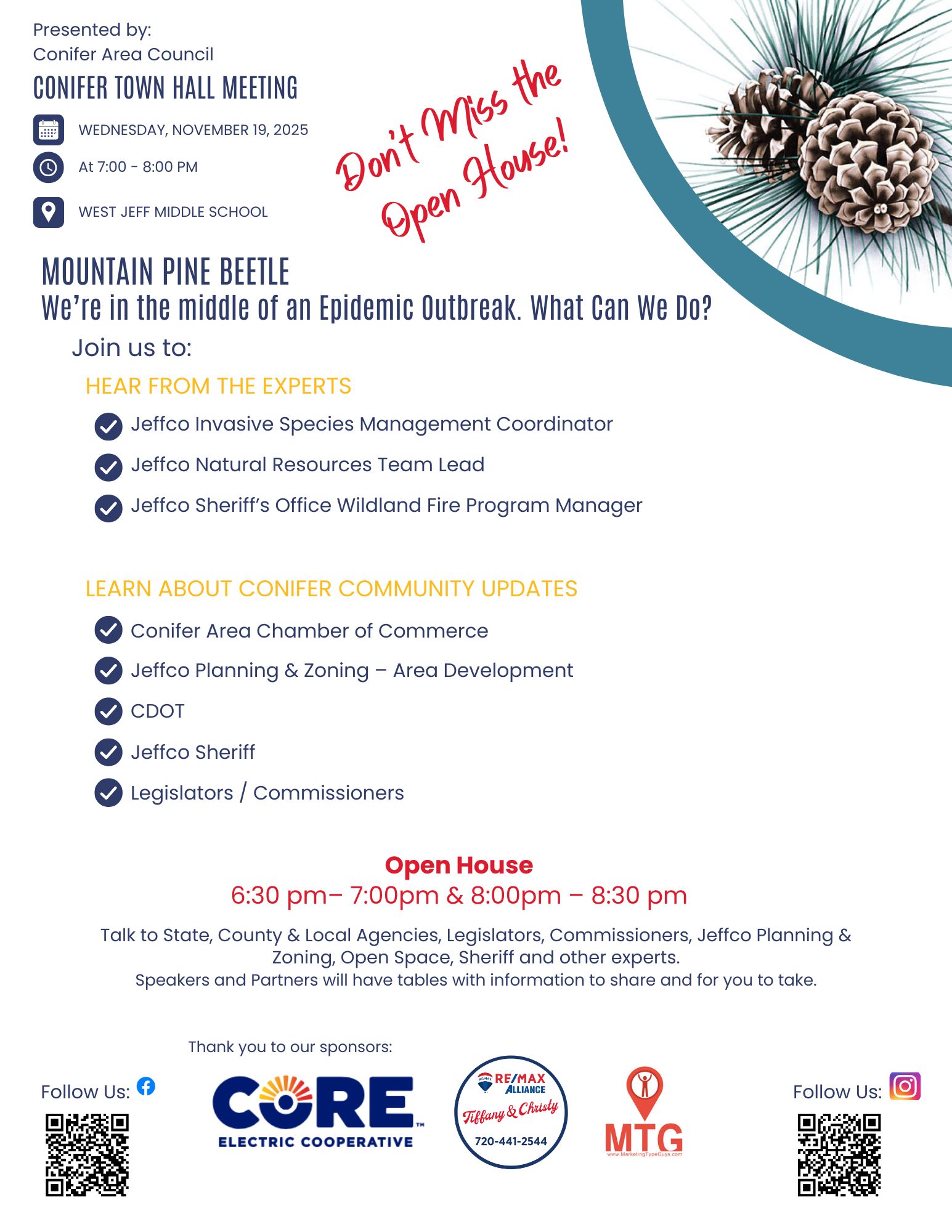 Have you noticed all the DEAD RED TREES in our community?! The Mountain Pine Beetle is demolishing our forests. Please attend the next Conifer Area Council Town Hall Meeting to find out what we can all do about it. Open House before and after the 7-8 pm presentation so you can talk directly with the presenters.