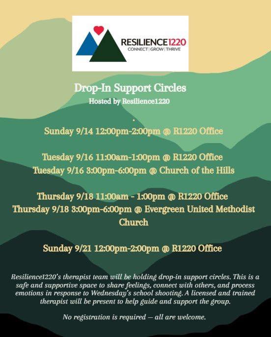 The Resilience1220 Team shares the heartache of our community. In response, we are providing free, drop-in support circles hosted by our R1220 trained therapists, and open to all. This is a safe and supportive space to share feelings, connect with others, and process emotions in response to yesterday's school shooting. Here is the schedule of our offerings:
