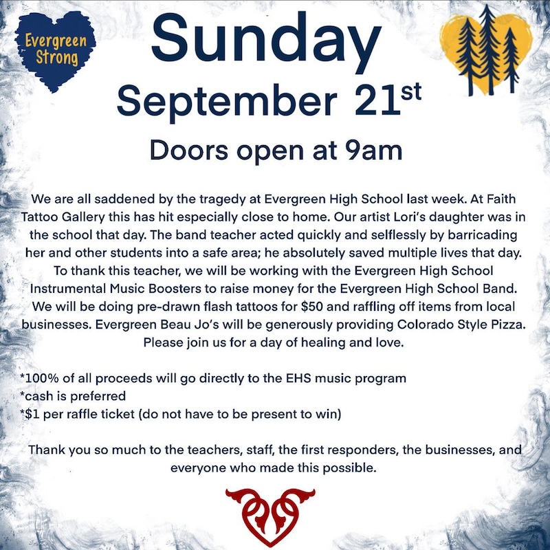 To thank this teacher, we will be working with the Evergreen High School Instrumental Music Boosters to raise money for the Evergreen High School Band. We will be doing pre-drawn flash tattoos for $50 and raffling off items from local businesses. Evergreen Beau Jo's will be generously providing Colorado style pizza. Please join us for a day of healing and love.