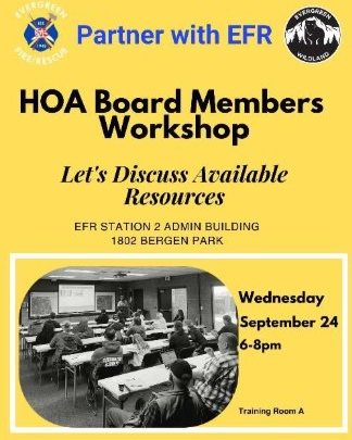 we're inviting all HOA Board Members to join us for a workshop on how we all can work together to reduce wildfire risk in our community. Join us on 9/24 at the EFR administration building (1802 Bergen Parkway) from 6 to 8 p.m. It's free and no RSVP is needed.