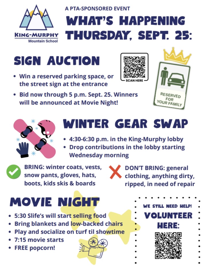 Bid for the two elite parking spaces on either side of the stairs in the main parking lot. The spot will be yours for the entire 25/26 school year and will have a custom sign with your last name on it! Or bid on the street sign. Pick a name for the street that goes through the main parking lot. A customized sign will be placed at the bottom of the street for all to see! All proceeds will provide funding for some of the numerous items needing support this year (some examples of things the PTA pays for - e.g., classroom learning materials, special events for students, subsidizing field trips, etc.).