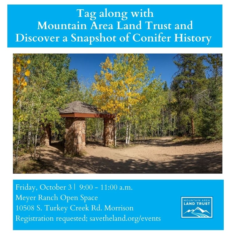 Tag along with Mountain Area Land Trust (MALT) and discover a snapshot of Conifer history at the iconic Meyer Ranch property. Stroll wide-open meadows, hike through lodgepole pine forests and aspen groves, and learn about the benefits of connective corridors of public and private conserved land. This 2.5- 3-mile hike kicks off with an increase in elevation and leveling out before another push up. Approximately 90 minutes, moderate difficulty.