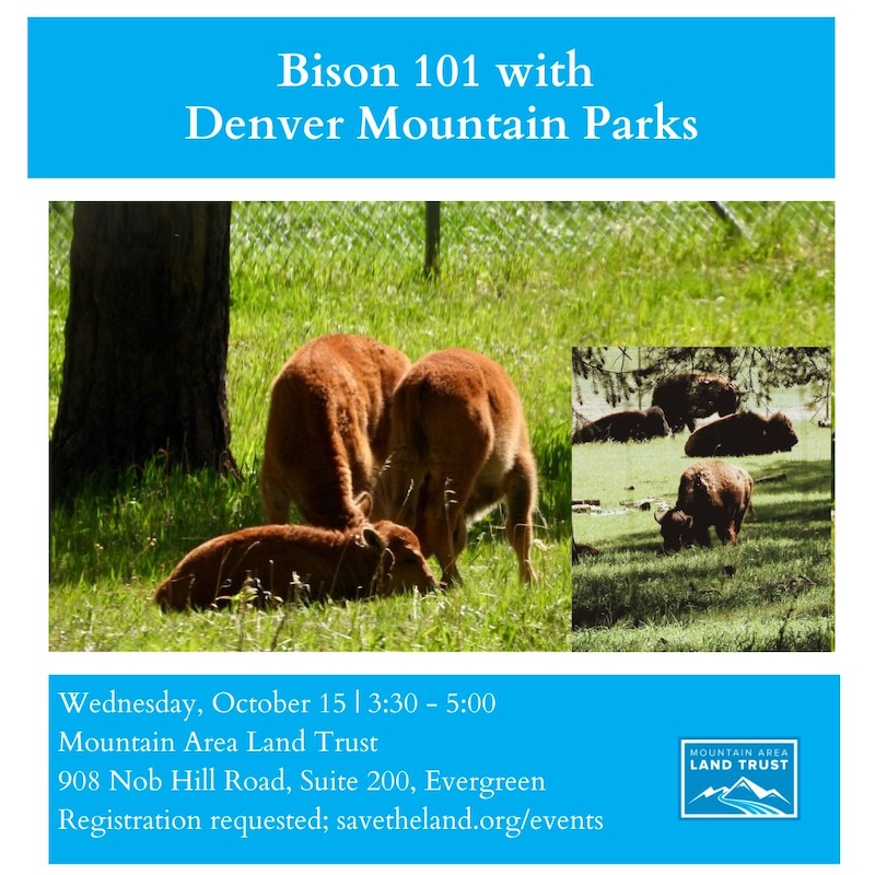 Mountain Area Land Trust (MALT) hosts Denver Mountain Parks (DMP) in this free community event to learn the history of DMP’s Bison herds, their conservation-oriented management, and the iconic cultural and ecological significance of Bison in the region. Whether you missed MALT’s hike with the Bison in Genesee earlier this spring, or the outing ignited excitement, curiosity, and a quest for more information on these majestic animals – don’t miss out on this unique lecture by DMP.