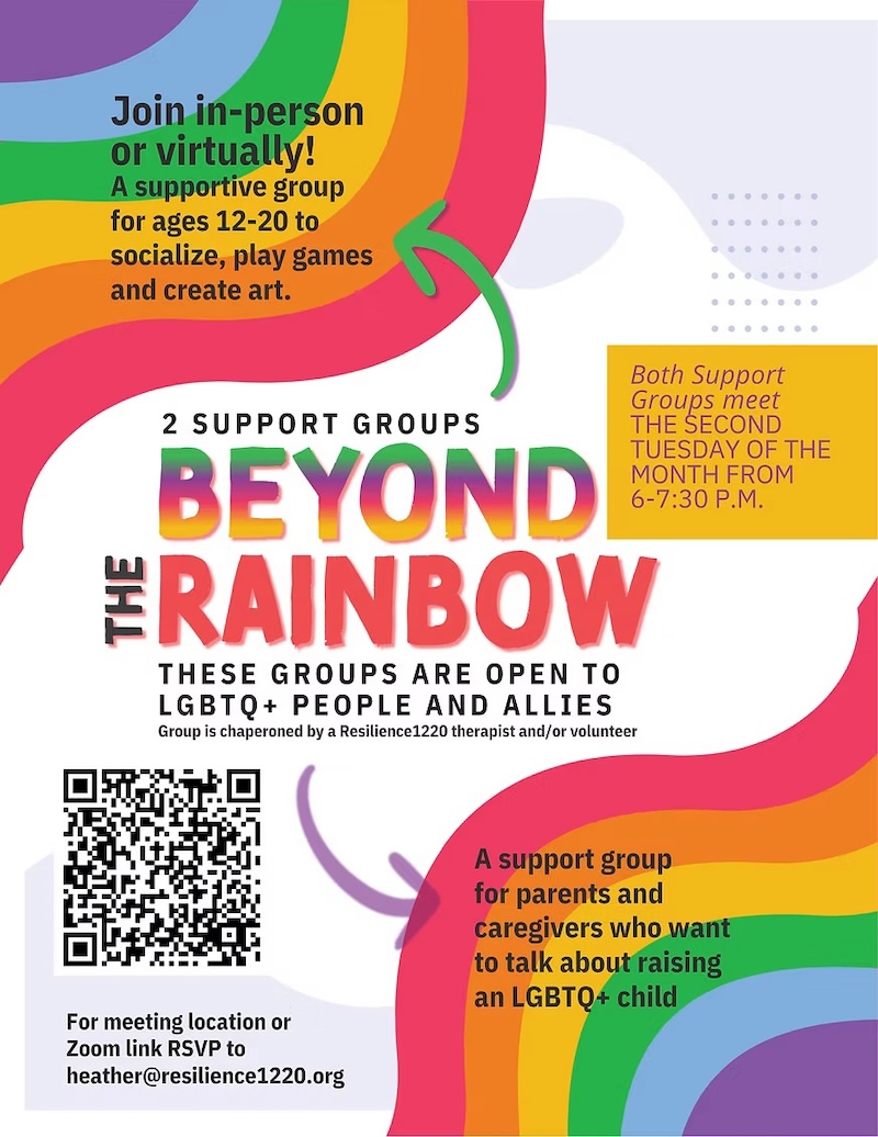 Two Support Groups: A support group for ages 12-20 to socialize, play games and create art, and a support group for parents and caregivers who want to talk about raising an LGBTQ+ child. Both support groups meet the second Tuesday of the month from 6-7:30 pm. They are open to LBGTQ+ people and allies. To RSVP and/or request a Zoom link, contact This email address is being protected from spambots. You need JavaScript enabled to view it.