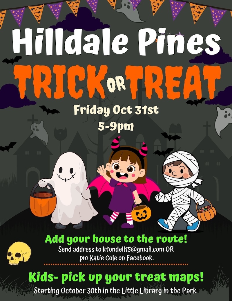 Mark your calendars! TheĀ 4th annual Trick-or-TreatĀ night is coming to Hilldale Pines! Invite your friends to come along and collect treats & goodies throughout the neighborhood.