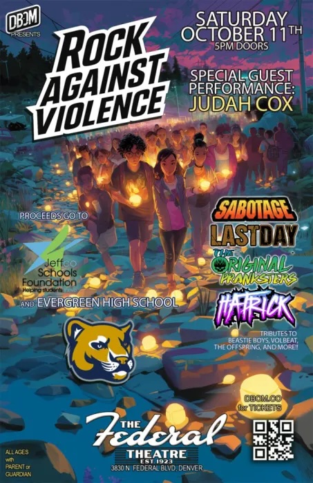 On Saturday, October 11, 2025, Denver’s music community will unite for Rock Against Violence, a benefit concert at the historic and recently renovated Federal Theatre. Proceeds will go directly to support victims, families, and the Evergreen High School community following the recent tragedy via the JeffCo Schools Foundation.