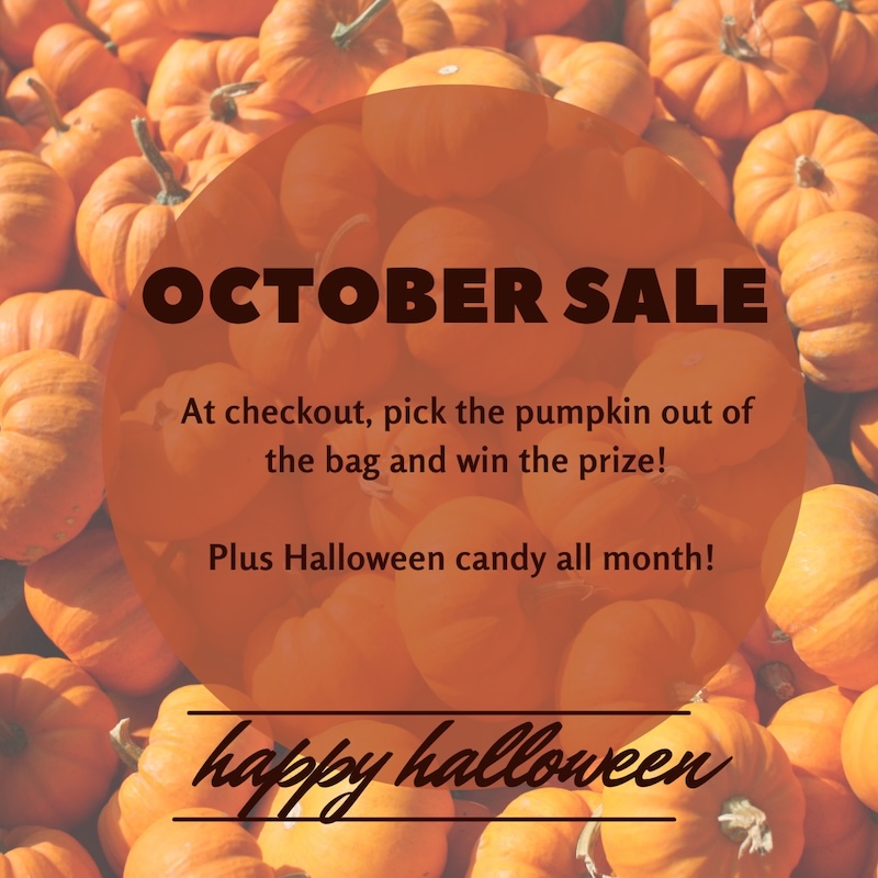 Spooky season is here!! Come get cozy in the boutique and shop local! This month there will be a set of pumpkins at checkout, pick the pumpkin and get the % off of goodie displayed. We have some great prizes.