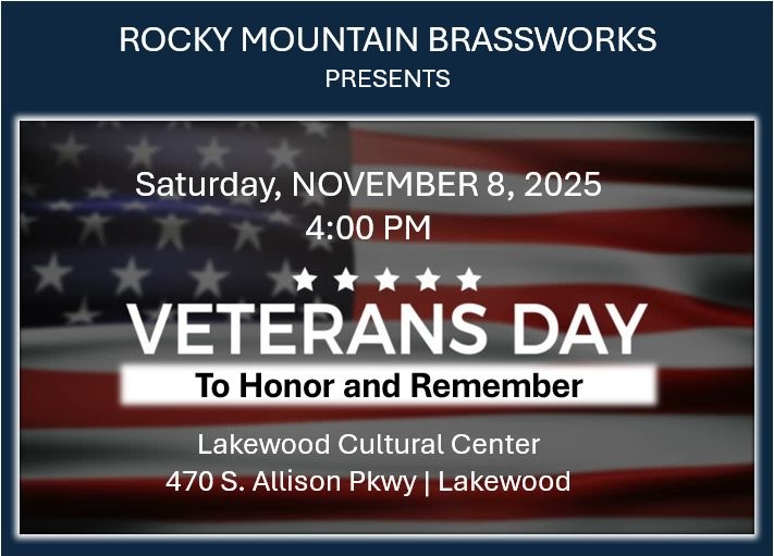 Join Rocky Mountain Brassworks at the Lakewood Cultural Center for an inspiring evening of patriotic music honoring the courage and sacrifice of our veterans. Featuring classics such as the Armed Forces Medley, The Patriot by Philip Sparke, Eternal Father, Strong to Save, and the rousing Bugler’s Holiday cornet trio, this concert celebrates the spirit of service and remembrance.