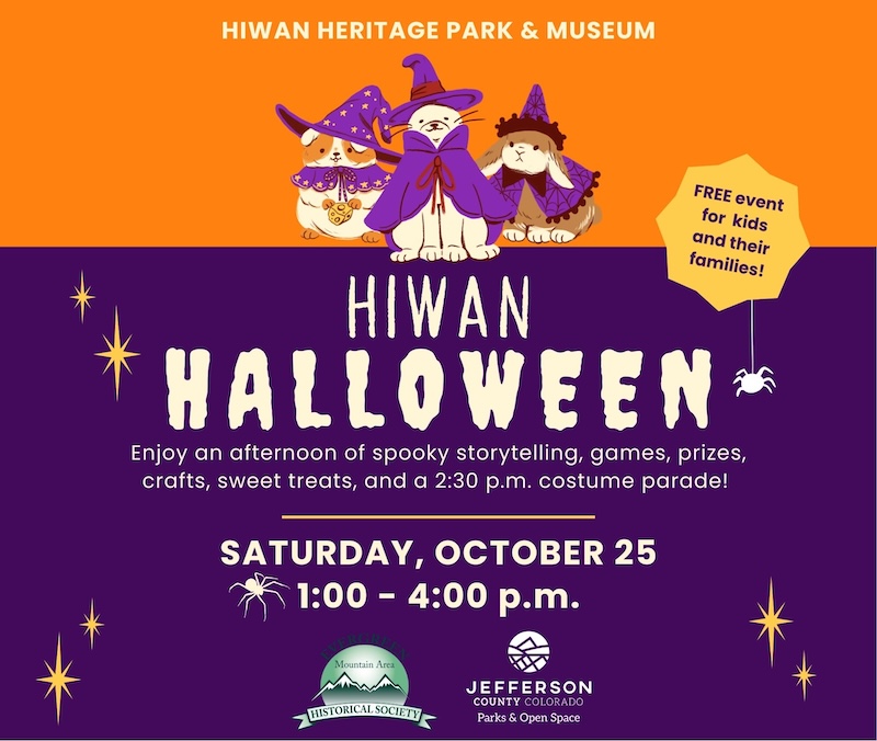 Free event for kids and their families! Enjoy an afternoon of spooky storytelling, games, prizes, crafts, sweet treats, and a 2:30pm costume parade at Hiwan Heritage Park & Museum on Saturday October 25th from 1:00-4:00pm.