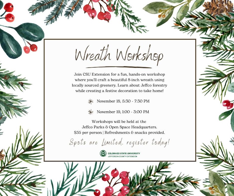 The holidays are creeping up fast! Get into the festive spirit early and join the Jeffco CSU Extension Office for a hands-on wreath making workshop this November!