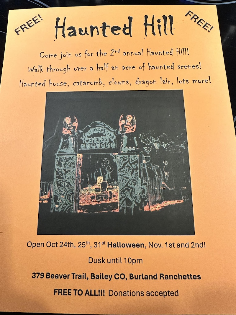 Come join us for the 2nd annual Haunted Hill. Walk through over half an acre of haunted scenes! Haunted house, catacomb, clowns, dragon lair, lots more! Open dusk until 10pm.