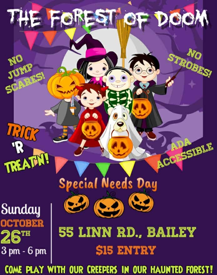 For those with special needs, The Forest of Doom is holding a special day with no jump scares, no strobe lights, and a more accessible course on October 26th from 3-6pm!