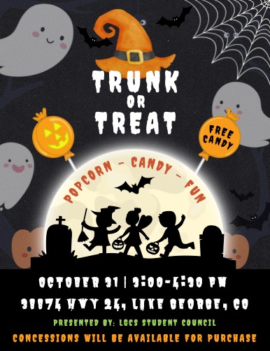 The Lake George Charter School Student Council presents Trunk Or Treat on October 31st from 3:00-4:30pm. Concessions will be available for purchase.