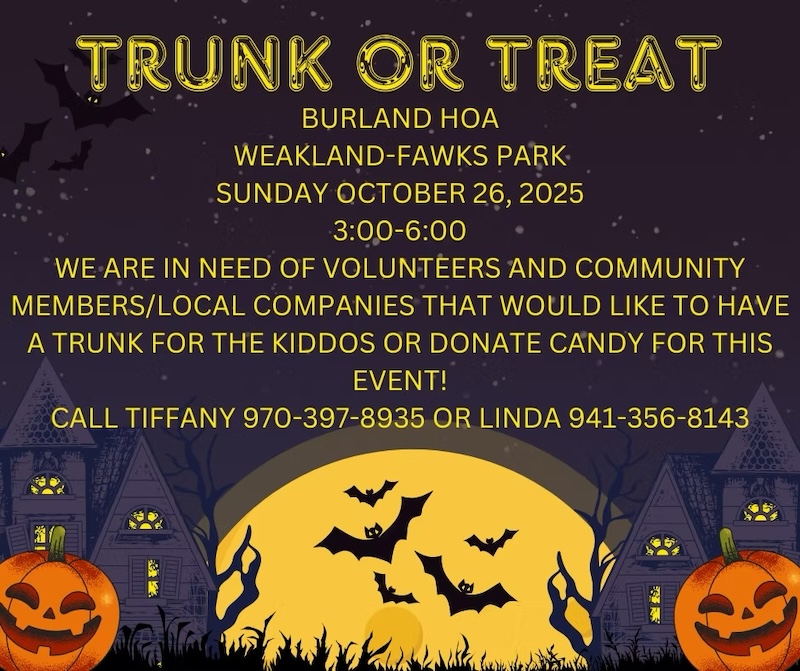 Burland HOA is in need of volunteers to help make their Trunk Or Treat a success. Please call Tiffany at 970-397-8935 or Linda at 941-356-8143 if you can set up a trunk or donate candy. Thank you!