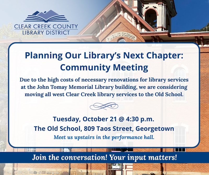 From Clear Creek County Library: We encourage all community members and stakeholders to join the conversation about moving west Clear Creek library services to the Old School. Your input matters as we look to the future of library services in Georgetown!