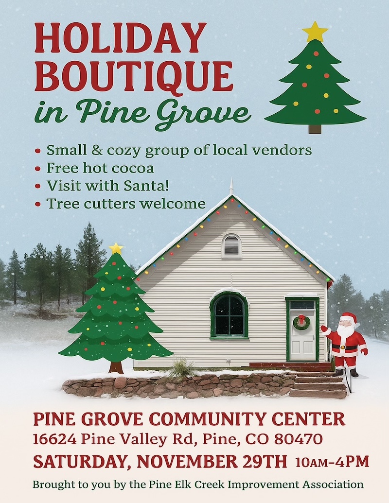 Join us at the Pine Grove Community Center (16624 Pine Valley Rd, Pine, CO) on Saturday, November 29th from 10AM–4PM for a festive day of community, FREE cocoa, FREE pictures with Santa, and plenty of holiday cheer.