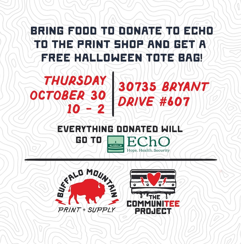 This Thursday! Bring some canned food or other donation items to the print shop between 10 and 2 and get a free Halloween tote bag! We have some left over from our print party and want to help boost donations for @echocaresco heading into November.