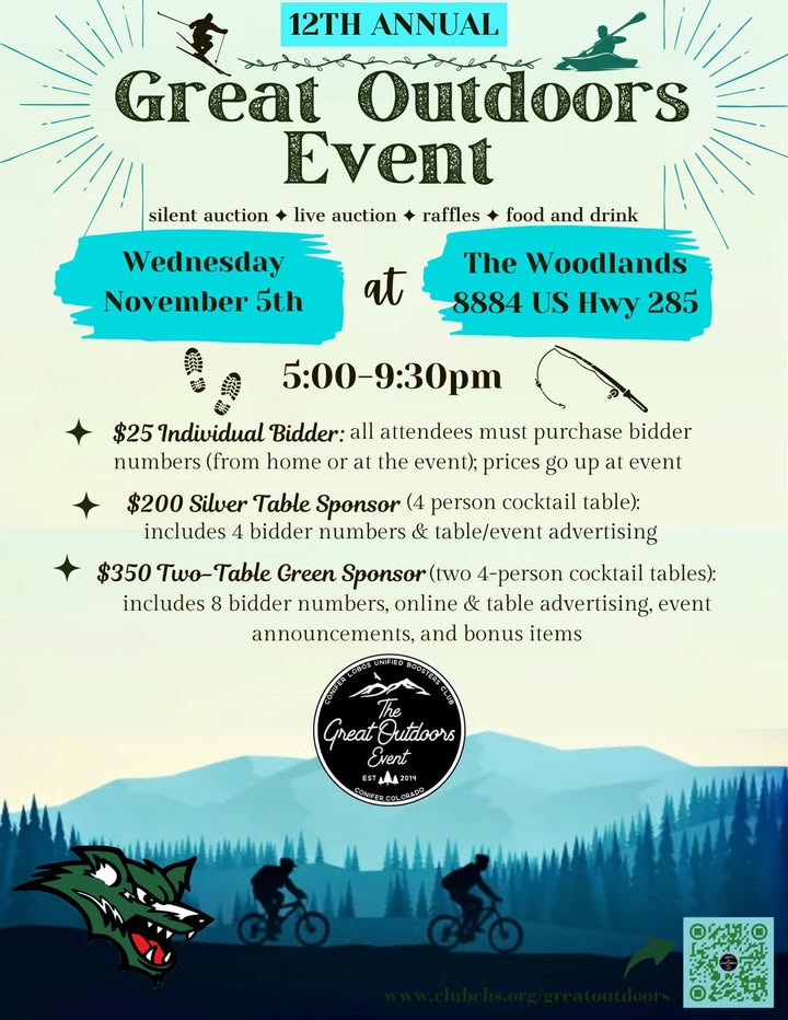 The 12th Annual Great Outdoors Fundraiser Event is Conifer Lobos Unified Boosters (CLUB) annual fall fundraiser with early-access online bidding for the silent Auction opening on November 4, at 8:00 am. Come support our local high school and buy some great holiday gifts or something for yourself.